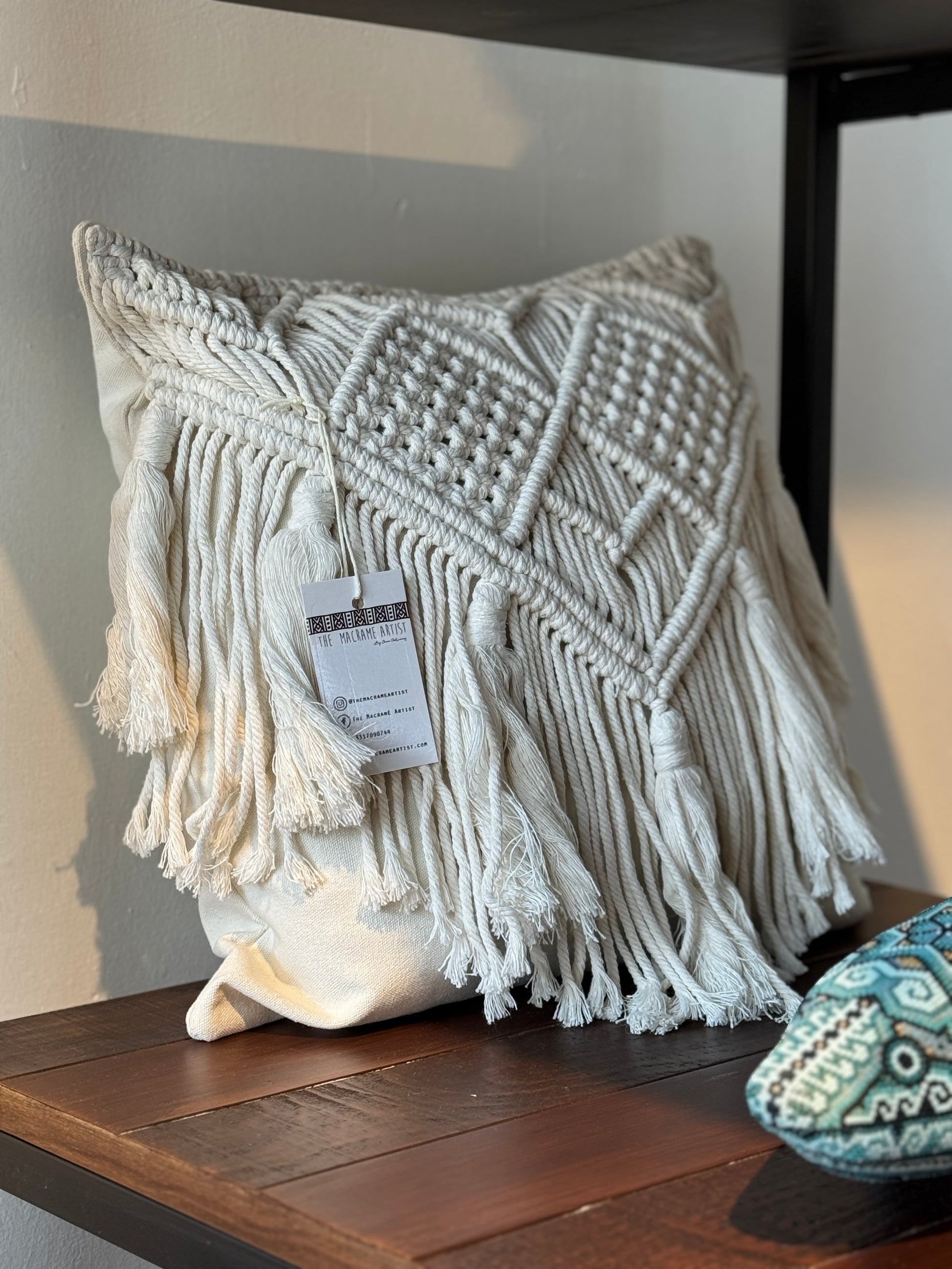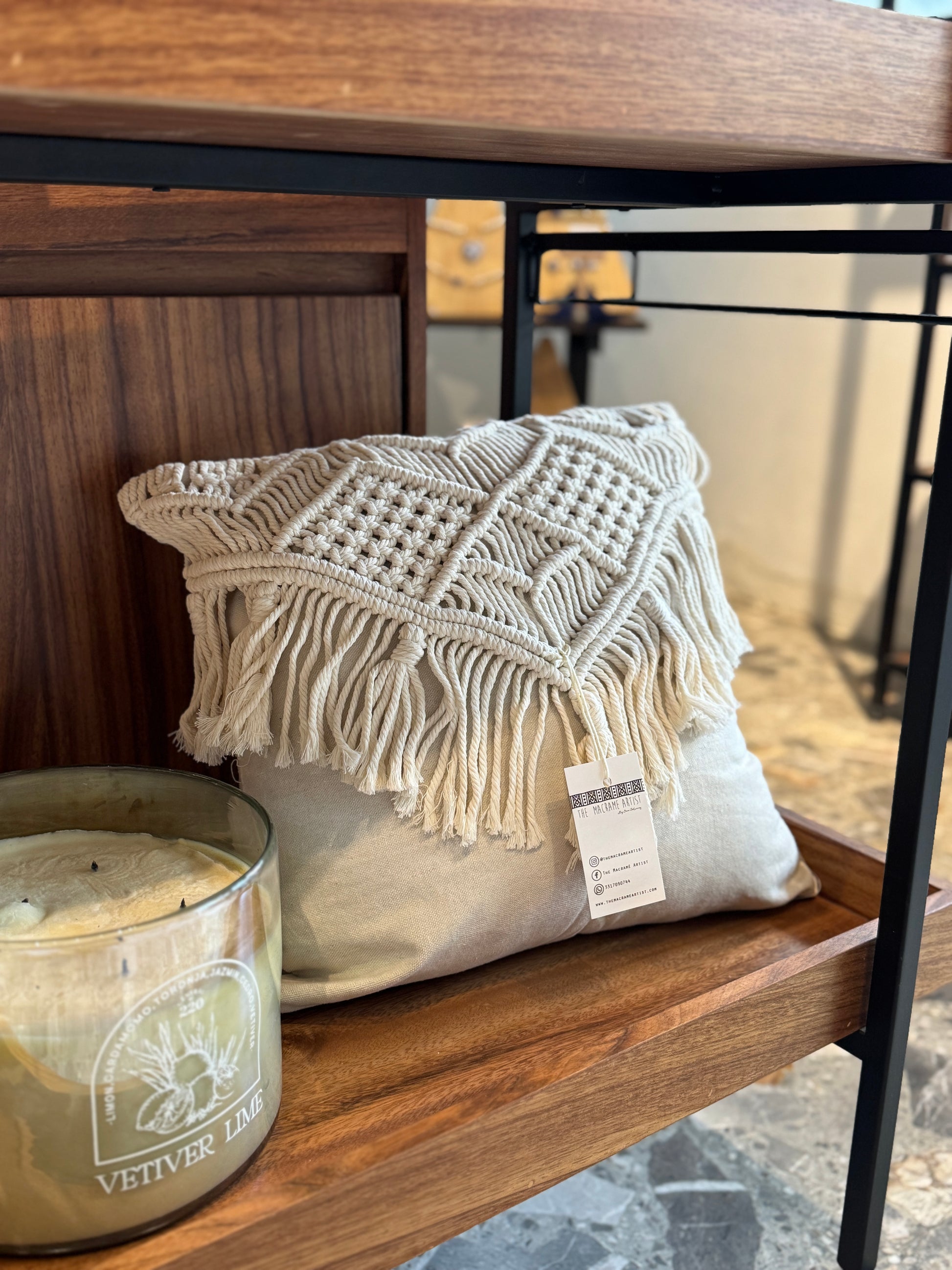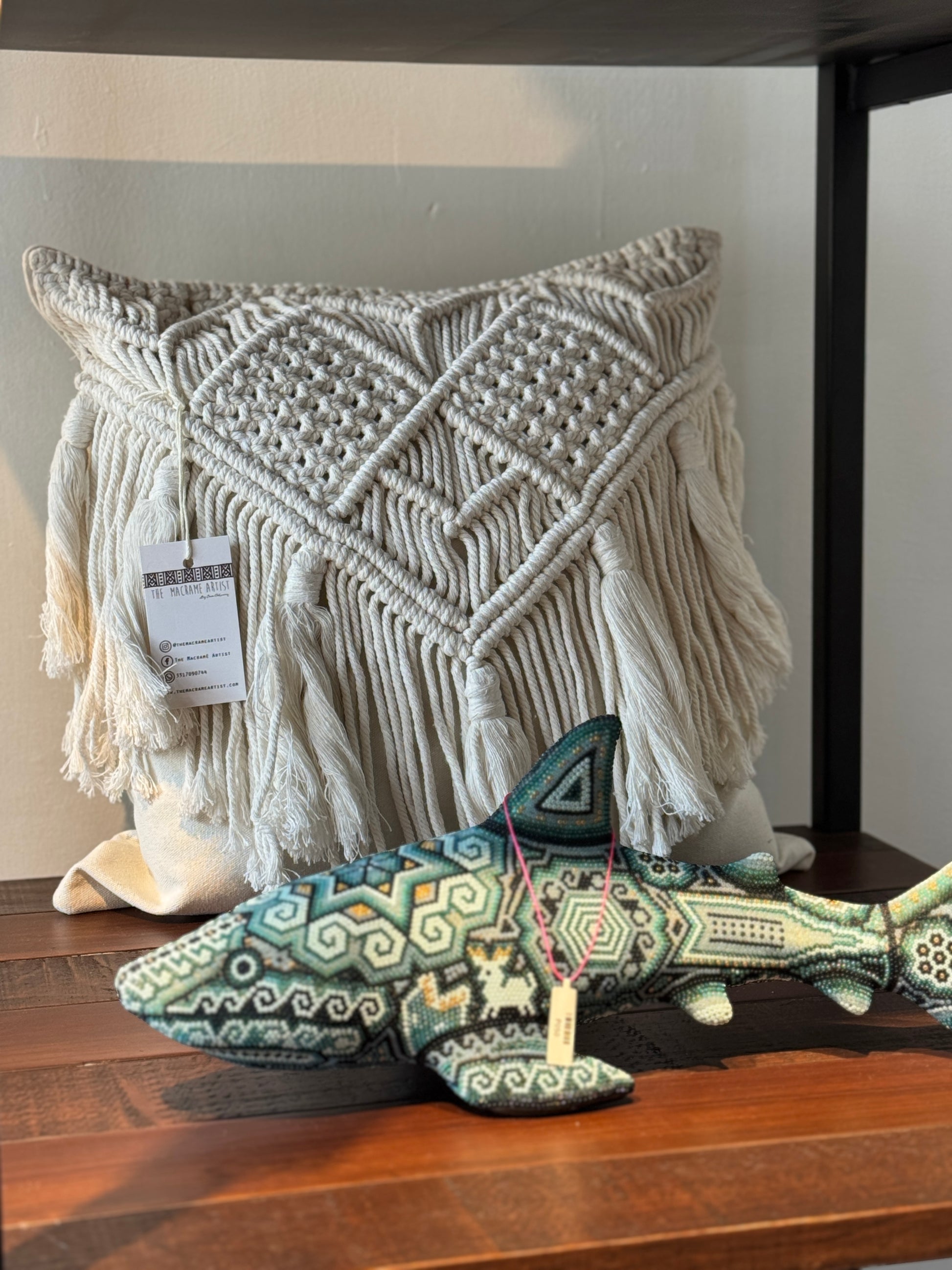 Inspirado en la serenidad de las lagunas, el Cojín Bacalar es una pieza tejida a mano en macramé que aporta textura, calidez y un aire bohemio a cualquier espacio. Cada nudo está elaborado por artesanas mexicanas bajo un modelo de comercio justo, convirtiéndolo en mucho más que un accesorio: es un fragmento de historia y tradición textil.