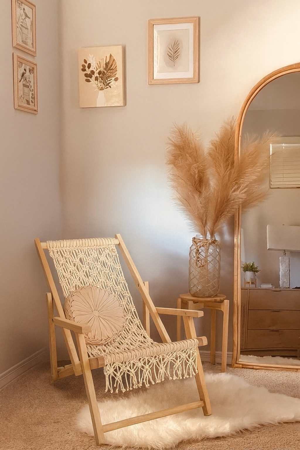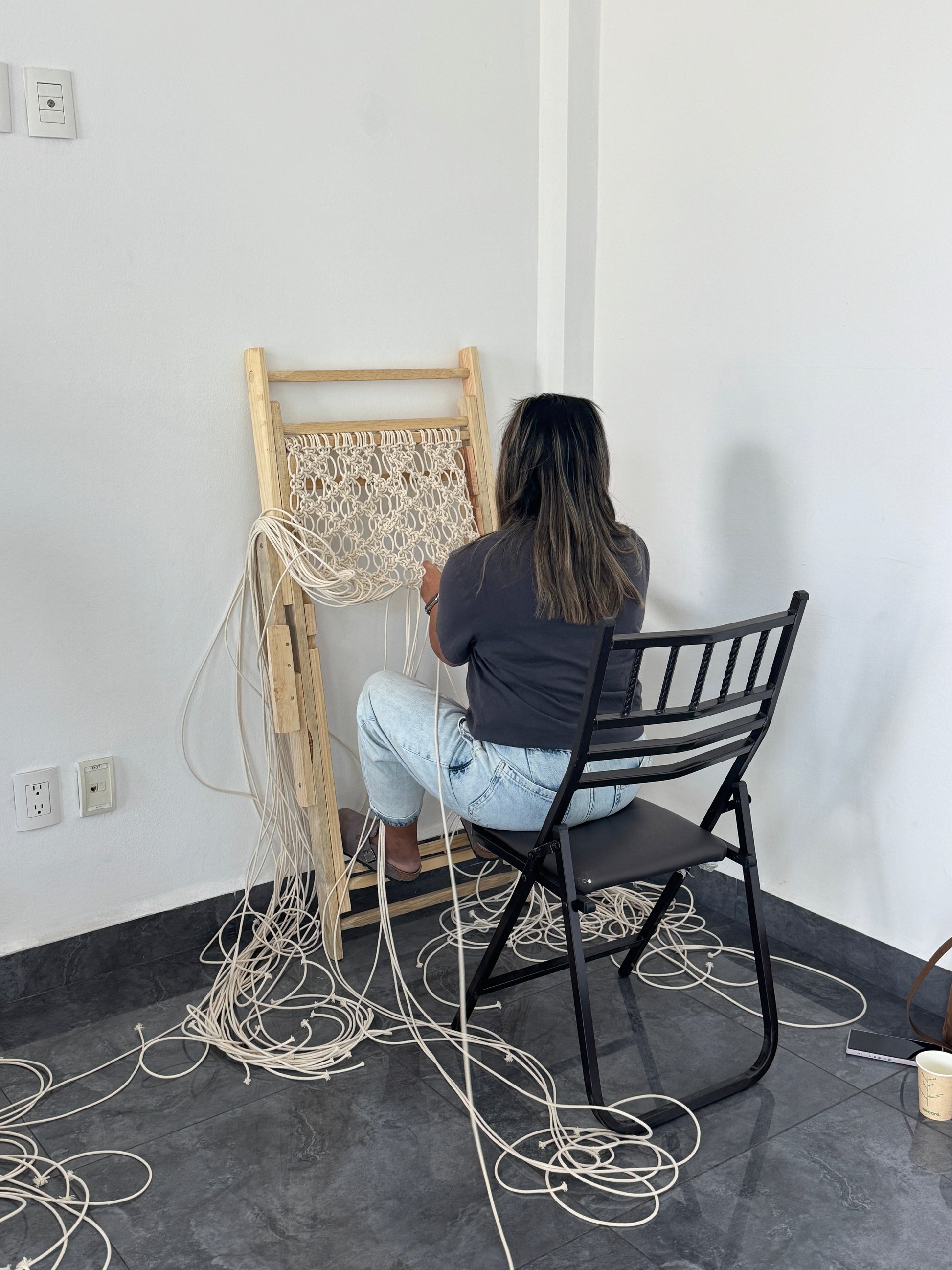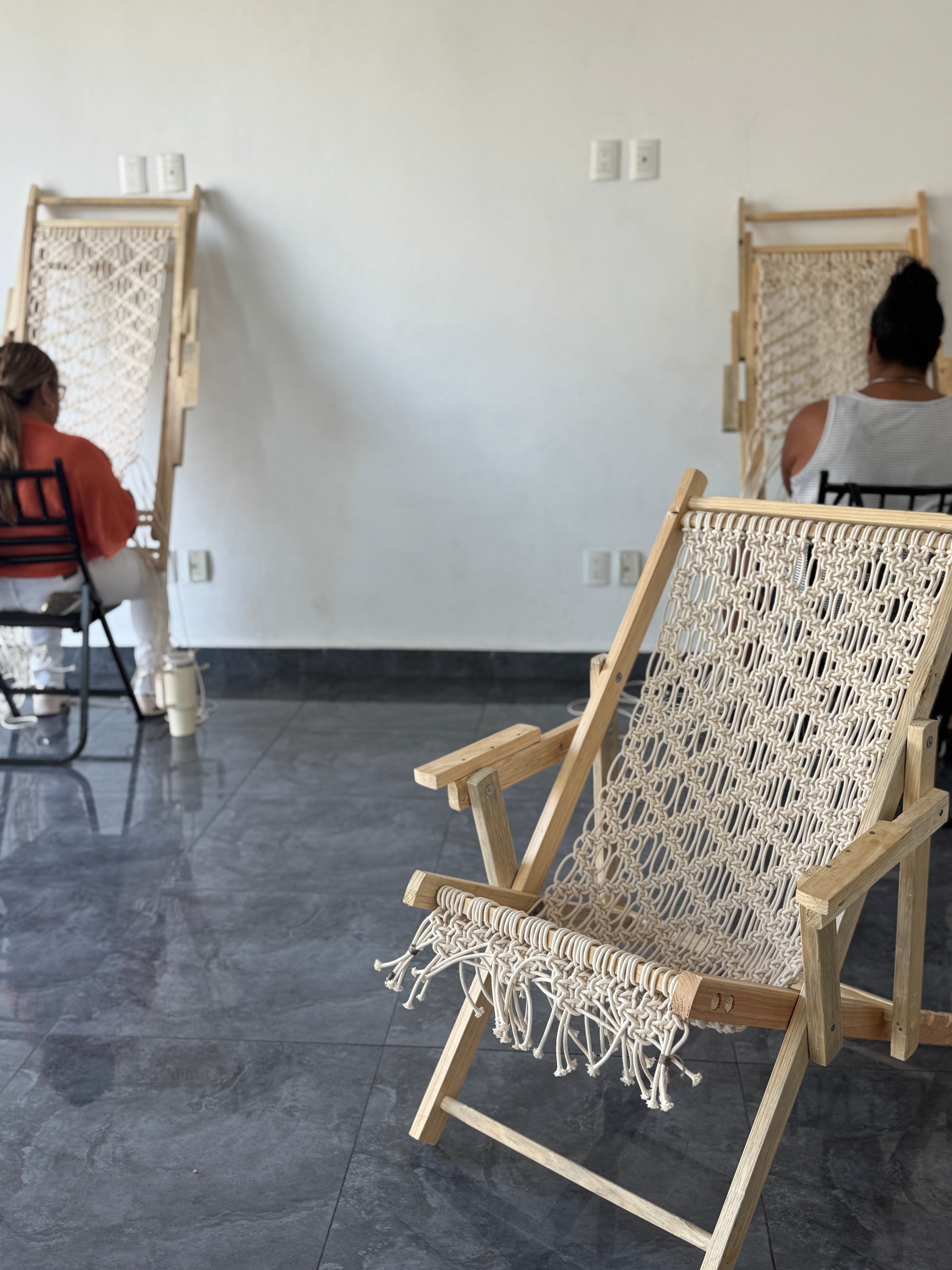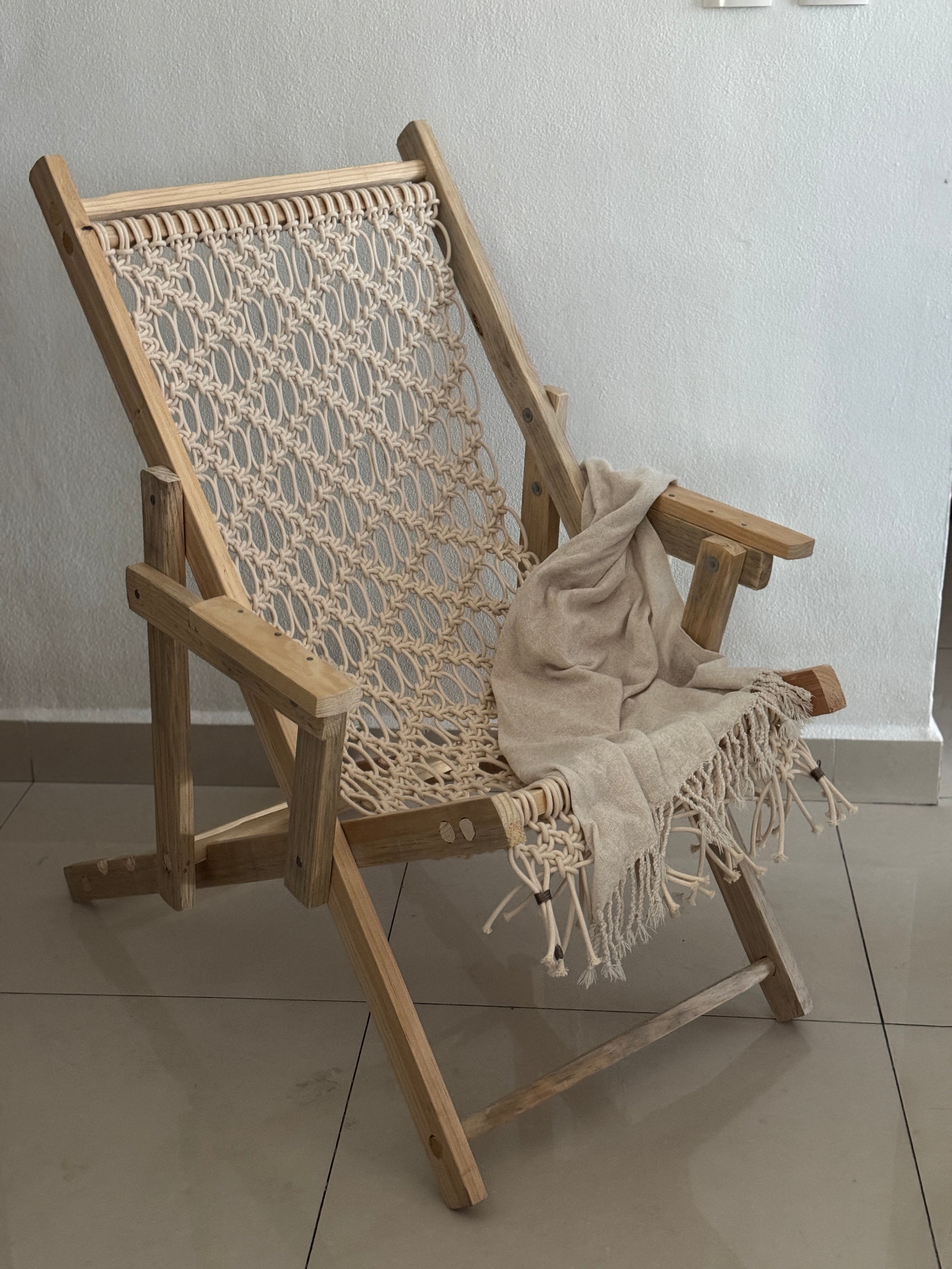 Estructura de madera de pino, natural sin barnizar, tejida a mano con algodón en la técnica de macramé.