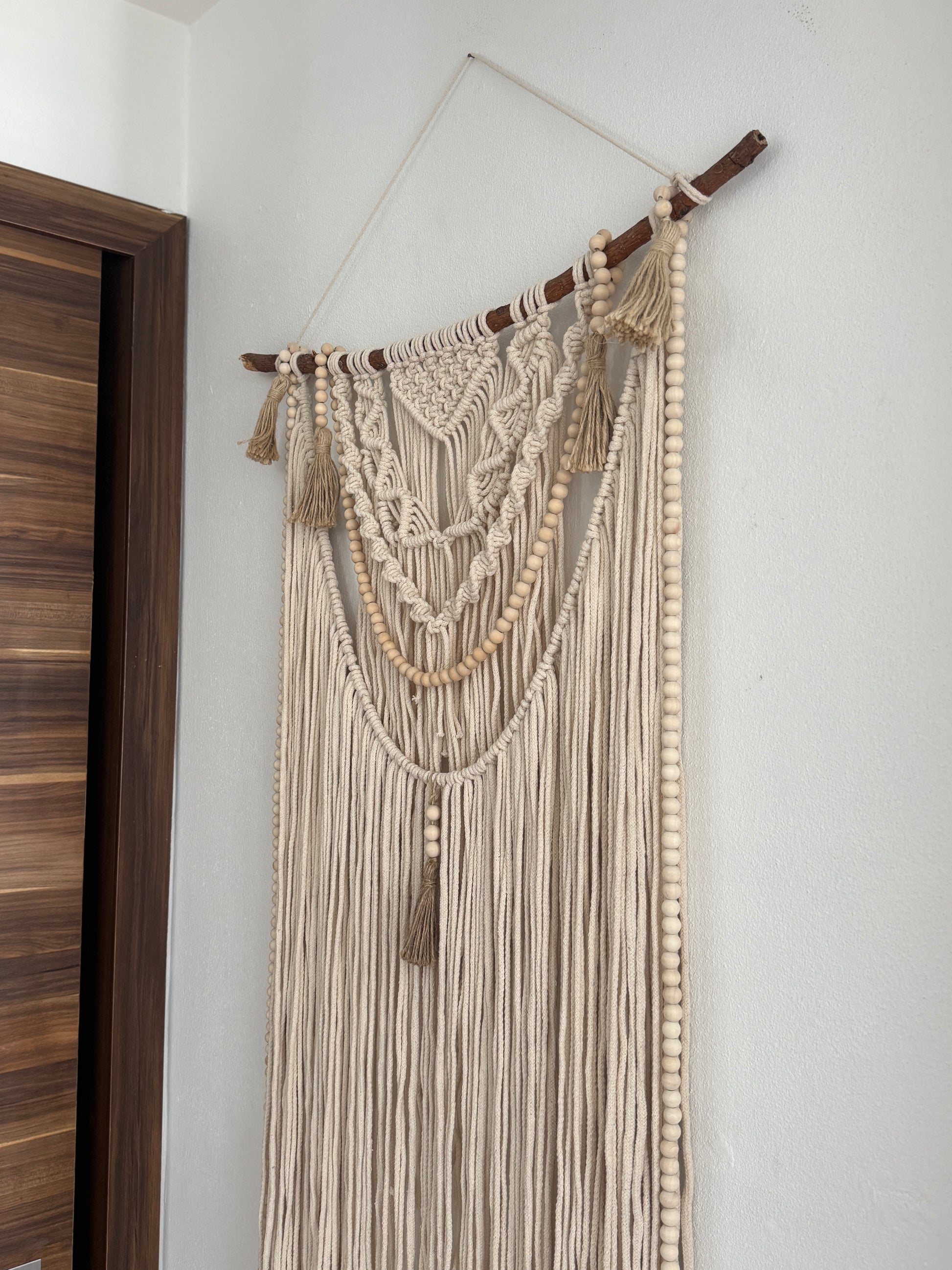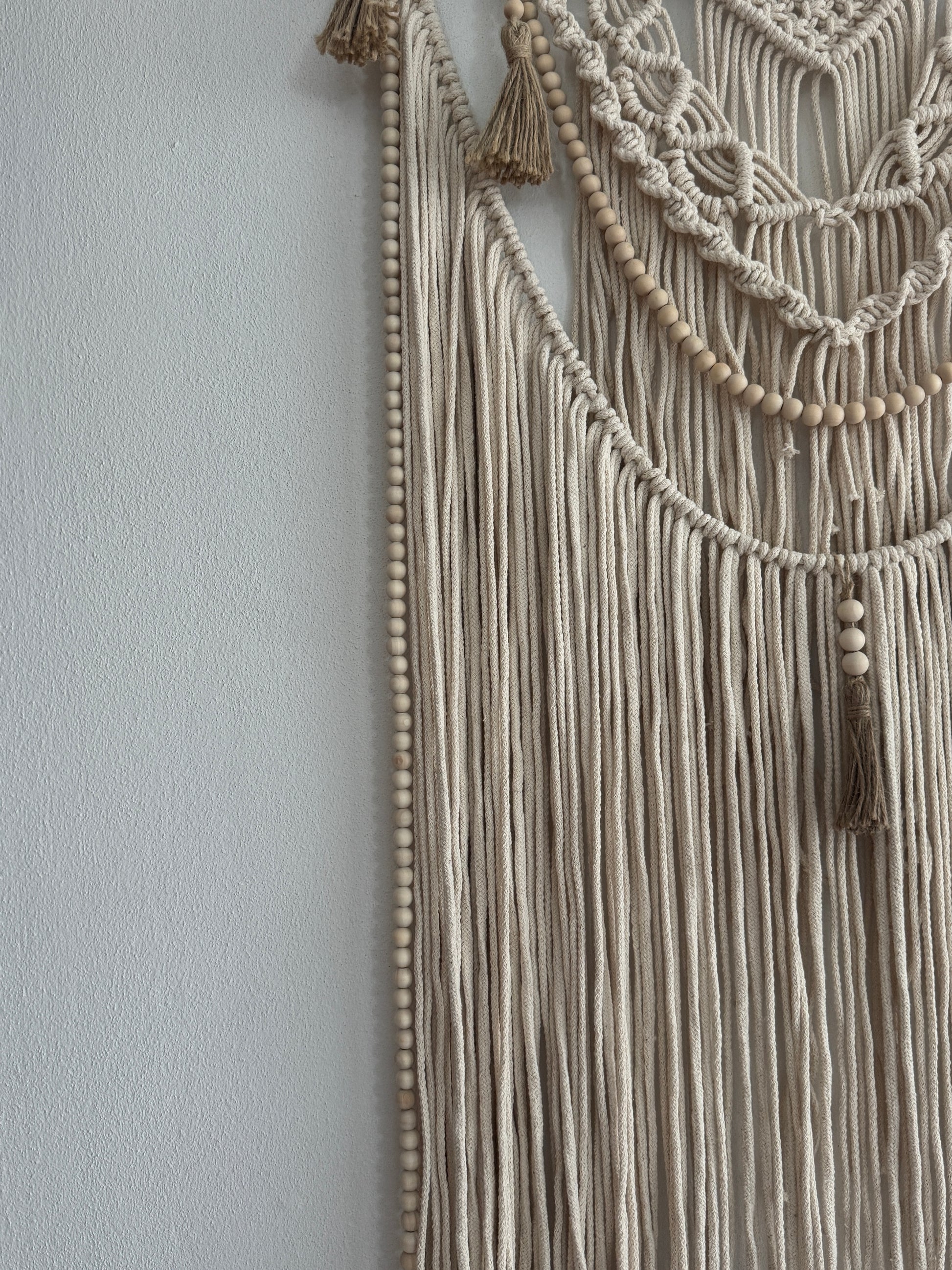 Su diseño combina texturas suaves, nudos simétricos y caídas fluidas que crean una sensación de armonía y ligereza, perfecta para espacios que buscan equilibrio, calma y belleza artesanal.